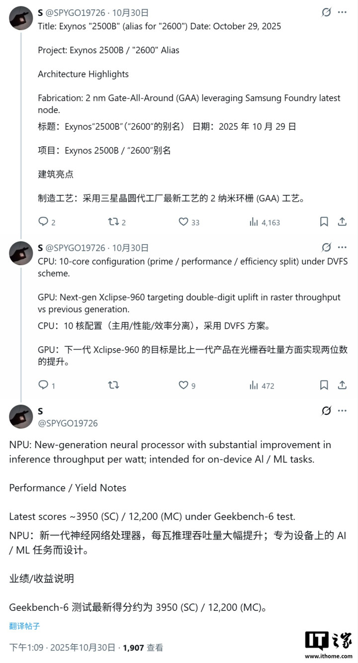 IT之家10月31日消息,消息源@SPYGO19726昨日(10月30日)在X平台发布推文,曝料称三星GalaxyS26Ultra手机正推进Exynos2600和第五代骁龙8至尊版双芯片方案测试,最终处理器版本尚未确定。